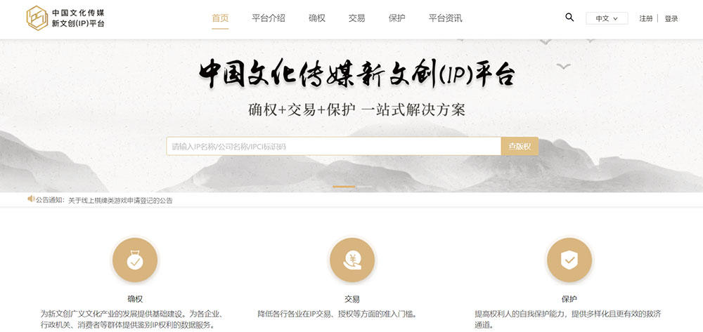 中国文化传媒新文创(IP)平台(www.ccmgip.com)是文化和旅游部直属央企——中国文化传媒集团,针对文化领域的侵权、盗版行为以及创造与运用脱节等现象推出的知识产权(IP)确权、交易、保护一站式服务平台,旨在为整个产业链搭建公共基础服务平台,以市场化的方式提供解决方案,为国家行政机构提供专业性的服务,为中外文旅企业在文旅创意产业领域的交流与合作提供一站式技术支撑和信息服务。中传悦众(北京)文化发展有限公司是中国文化传媒集团的全资子公司,承担集团“中国文化传媒新文创(IP)平台”[简称中传新文创(IP)平台]的运营管理工作。