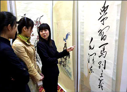 3月11日,毛泽东1950年2月27日为哈尔滨青年书写的书法真迹《学习马列主义》,在厦门国拍2004年迎春艺术品拍卖会上亮相。据悉,这是国内首次拍卖毛泽东书法真迹,此次拍卖毛泽东书法真迹吸引了众多市民和收藏者前来观看。(张生贵摄) 新华网
