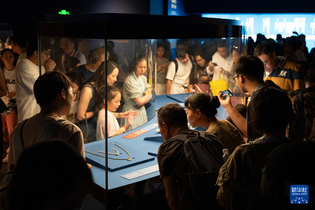 8月11日晚,观众在上海博物馆展厅内参观“金字塔之巅:古埃及文明大展”。