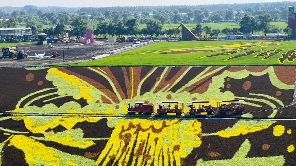 讲解员孙慧宇介绍,闫家岗农场的稻田画从每年5月初便开始设计,每年都有不同主题。专业团队先通过精准的定位系统,将设计图投射到水田之中,勾勒出图案线条。随后,由经验丰富的“绘画者”将不同叶色的秧苗插入指定区域。在水稻生长期间,工作人员还需实时监测稻苗的生长状态,根据实际情况调整施肥方案,确保颜色始终保持纯正,图案清晰不变形。