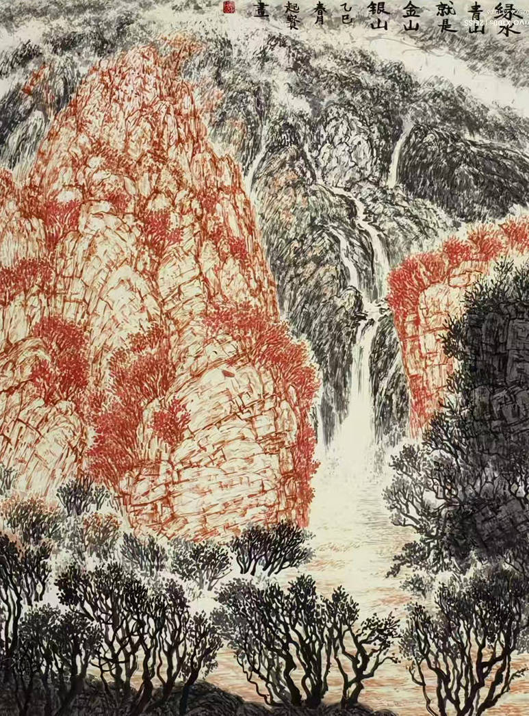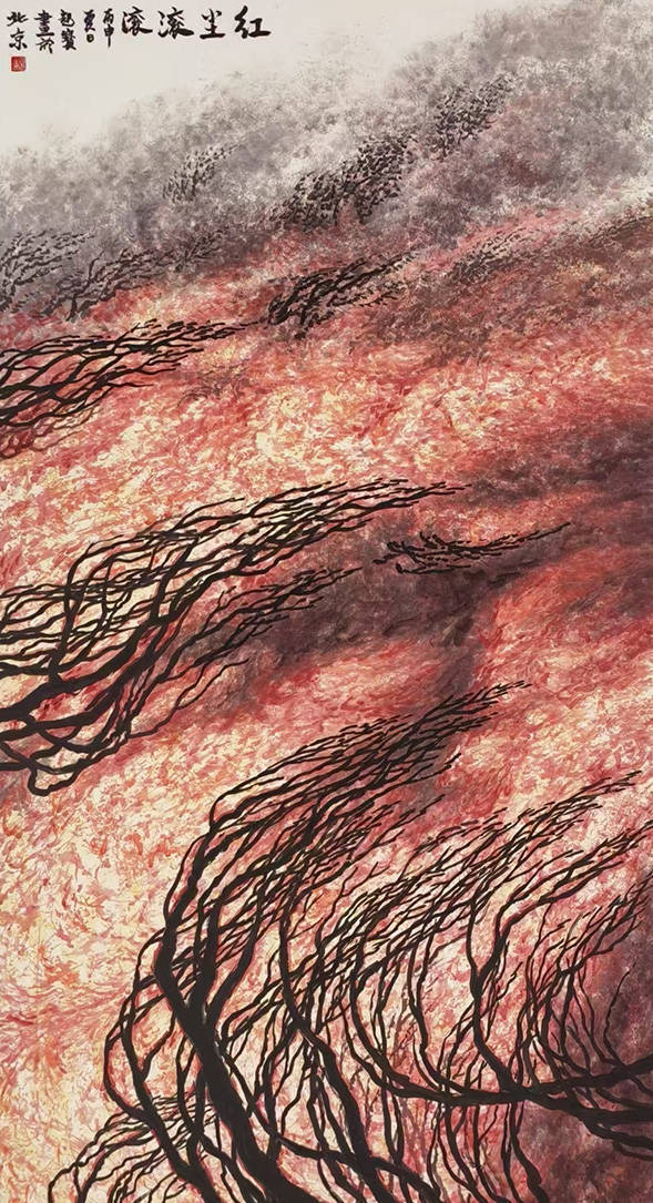 正如何起宝所言:“我的作品不仅仅需要体现技法,那未免流于肤浅,我认为更重要的是表达出我内心世界的思想。”何起宝“火”的创新风格在突破传统山水风格之上,又把自我想要传递的佛教思想完美的融入其作品当中,达到了传统山水融入创新风格而体现内心思想的完美结合。