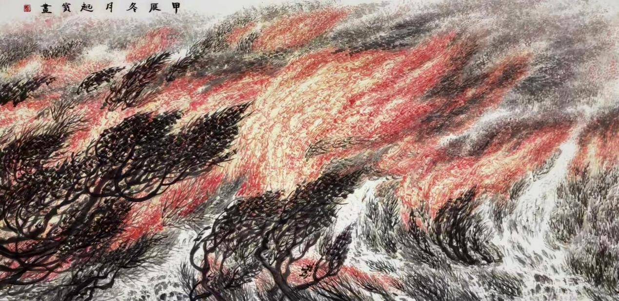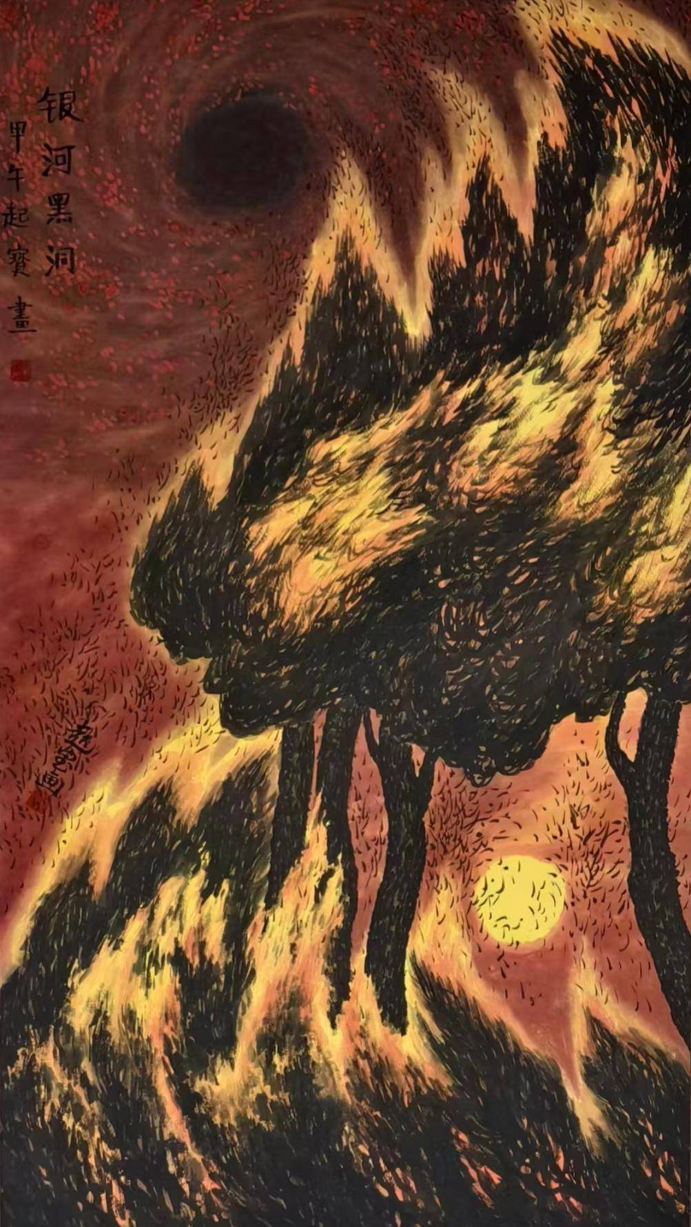 何起宝的作品借鉴自然物质之物来表现自己的思想观念和内心世界。对佛法有着精深研究的他把表现万物生命的和平、美好、希望的思想放在其艺术创作的首位,把强烈、积极向上、充满激情的内心世界融入到自己的作品当中。而“火”的创新艺术作为他的独有风格,在何起宝的绘画生涯中占据了最为重要的位置。画家通过自然载体,把内心世界的大美、激情通过那一团团熊熊燃烧的烈火以自己独创的艺术形式在传统的中国山水画中淋漓尽致的表现了出来。