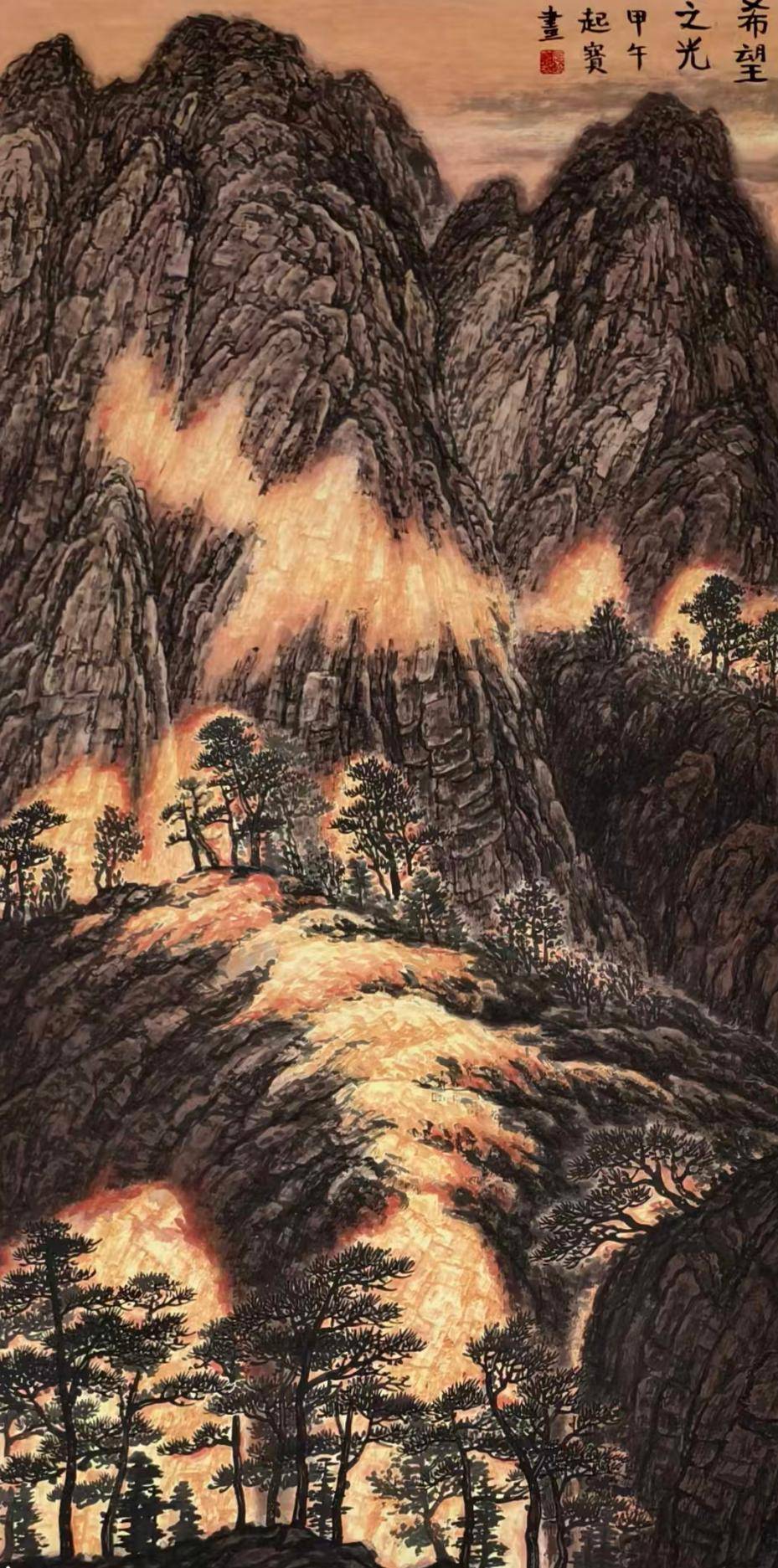 何起宝,1958年出生于河北省三河市,插过队,当过知青,人生经历丰富而坎坷。在荒无人烟的山林大漠工作多年的特殊经历,使得其性格也如大山一般,超绝而逸气超拔,师从著名画家陈克永先生习画多年,而陈克永先生为一代国画大师白雪石的入室弟子,这样看来,可以说何起宝也是白雪石大师的再传弟子。白雪石先生曾为北京山水画研究会的会长,曾多次为中南海绘制巨幅作品,何起宝继承了白雪石先生对于大场面的把握能力,接其衣钵,作品开创了“大气魄”,“大场面”,“大意境”的山水画风格。从中也可一窥白雪石先生广采博取北派,南派,运用传统技法和现代章法创造出具有独特风格的白派山水。而何起宝山水画中那苍莽大气的画风,劲健恣肆的笔墨运用,结构丰富细腻的画风又可看出其亲授老师陈克永的影响,而何起宝在兼收两位恩师艺术之精髓的基础上又以自己的天赋异禀与勤奋予作品以旋转强烈的动势、大胆不羁的色彩,笔到意达,笔笔直抒内心波澜壮阔的奔放激情,寓作品以深远的意境。画家在继承传统绘画技法风格的深刻体会之上,逐渐认识和形成了自己的艺术观念和笔墨技法,在自己几十年的艺术创作上逐渐形成了“火”和传统山水完美融合的独特风格,实现了几千年来传统山水画上的一个巨大突破与革新,也由此创立了独一无二的用“火”的特殊风格来表现中国传统山水画艺术的“火墨画”派系。