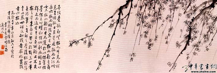 李方膺一生爱梅,久而成癖,画作上钤有“平生知己”、 “梅花手段”、 “冷香”等闲章,将梅喻为真、善、美的象征,渴望出现一个没有丑恶的朗朗乾坤。其住宿处,均命名为“梅花楼”,庭院周围栽满梅树,置身其中,吸香纳气。 《梅花图》倒挂艳梅数枝,枝条茂盛,寒葩冬萼挂满枝头,或含苞欲放、或初绽花片、或盛开怒放、或残英点点,正侧偃仰,千姿百态,晶莹透彻,傲寒不凋,杆枝挺劲有力。梅花分布富有节奏韵律,长枝处疏短枝处密,交枝处尤其花蕊累累,密而有序,乱中有法,珠玉进发,清气袭人,用折枝法,以浓淡墨加焦墨写梅树枝干,白描淡墨勾花,浓墨点蕊。浓淡相宜,俊朗苍秀,寒梅精气自现。画左侧作长题云:“予性爱梅,即无梅之可见,而所见之无非梅,日月星辰梅也,山河川岳亦梅也;硕德宏才梅也,歌童舞女亦梅也。触于目而运于心,借笔、借墨、借天时晴和、借地利幽僻,无心挥之而适合乎,目之所触又不失梅之本来面目。苦心于斯三十年矣,然笔笔无师之学,复杜撰浮言以惑世诬民,知我者梅也,罪我者亦梅也。乾隆二十四年四月初六日写于金陵借园虎溪桥。李方膺。字晴江,江南通州人。”钤白文印三方。